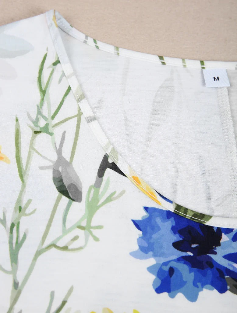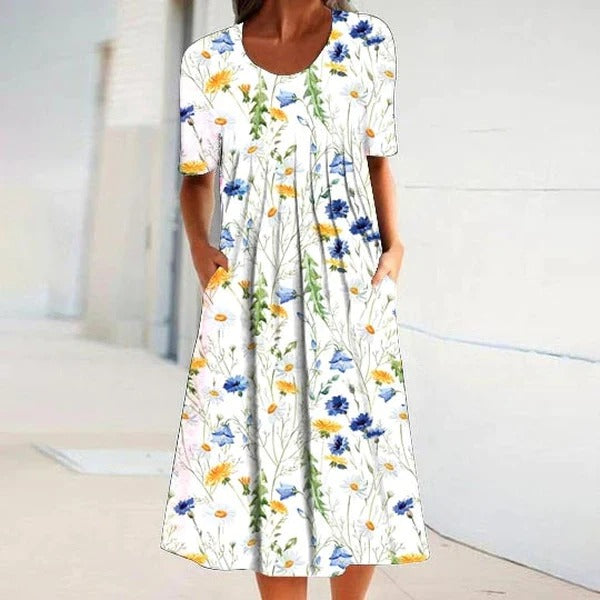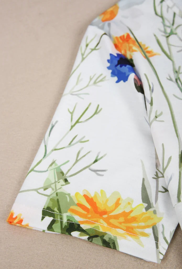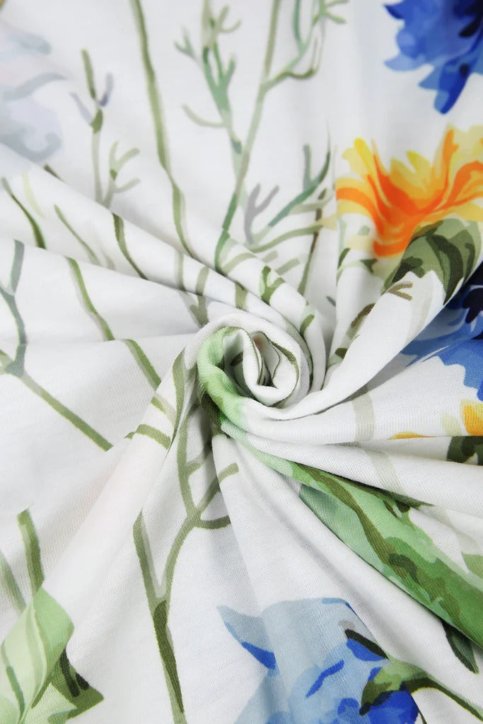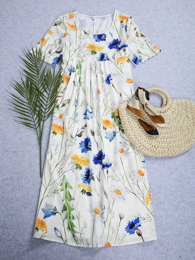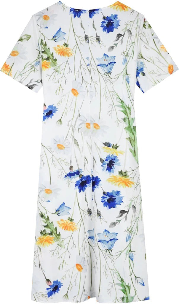 Yellow and Blue Floral Short Sleeve White Pleated Midi Dress