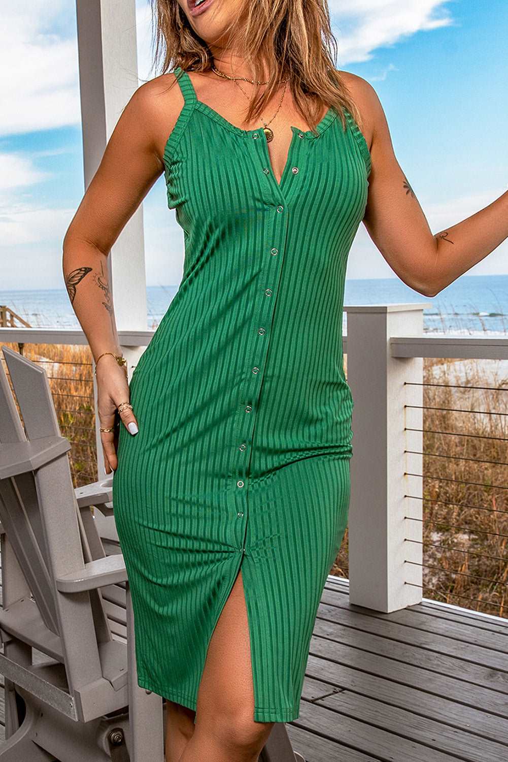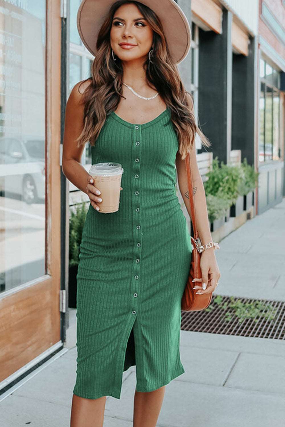 Buttoned Ribbed Sleeveless Bodycon Midi Dress