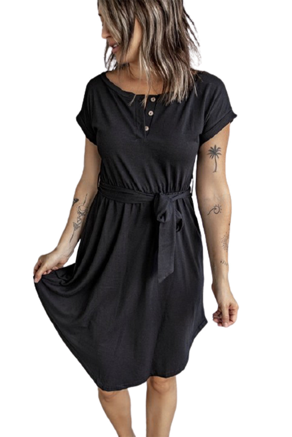 Buttons Crewneck Lace-up High Waist Mini Dress