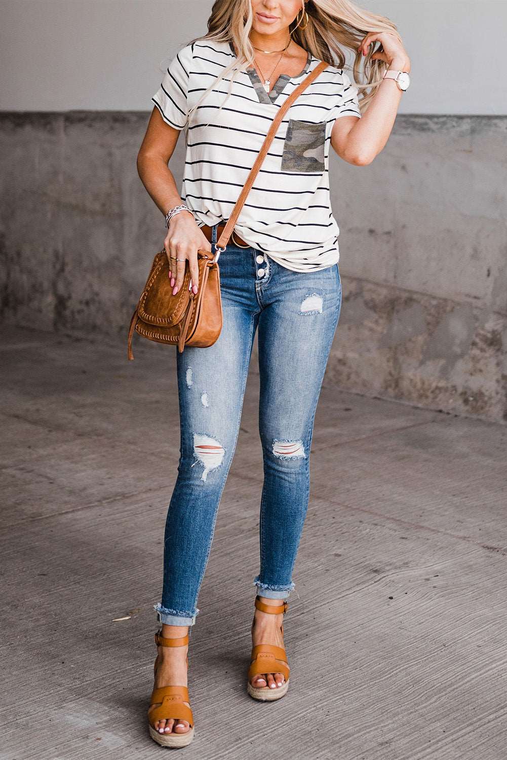 •Striped print t shirt is very casual, basic and chic •Pocket front design adds some fashion details to the tee... Read more