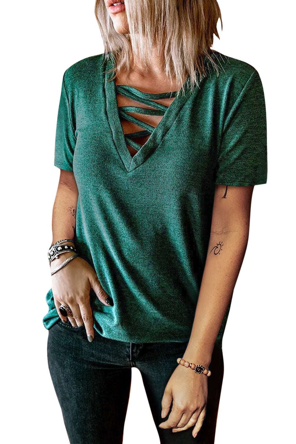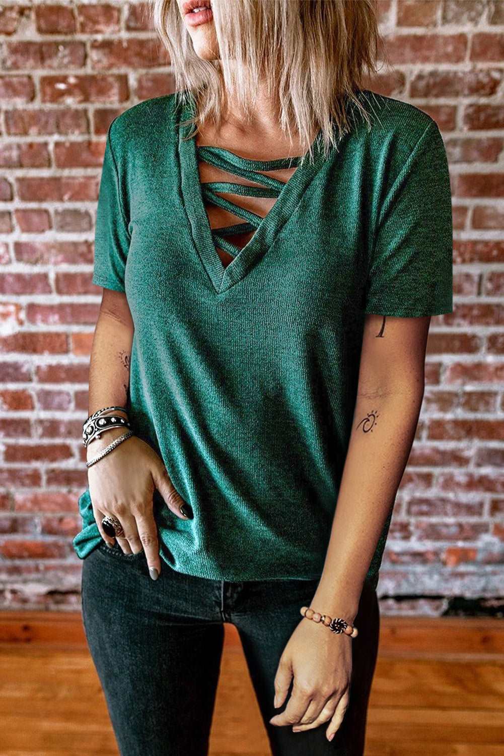 Criss Cross V Neck Short Sleeve Knit T-shirt