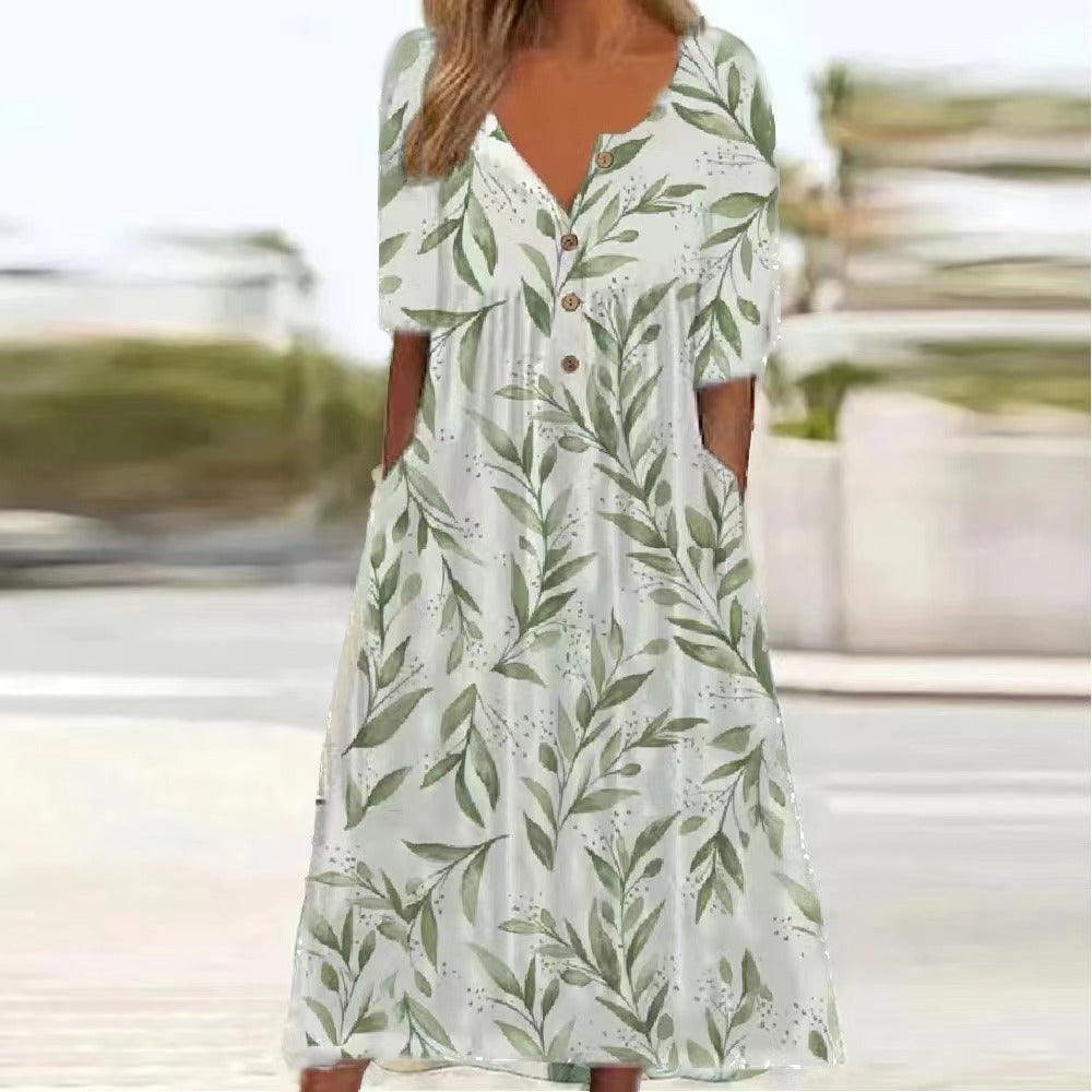 Green Paradise Short Sleeve Pleated Side Pocket Midi Dress