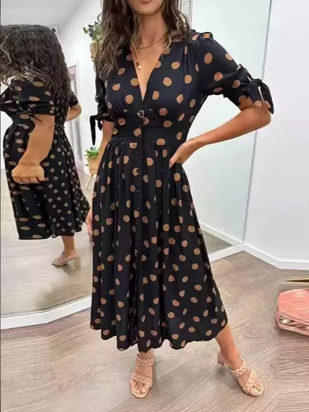 V-neck Polka Dot Waist Casual Dress