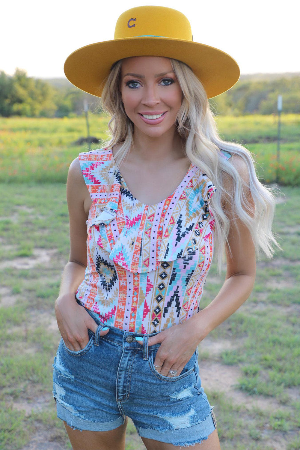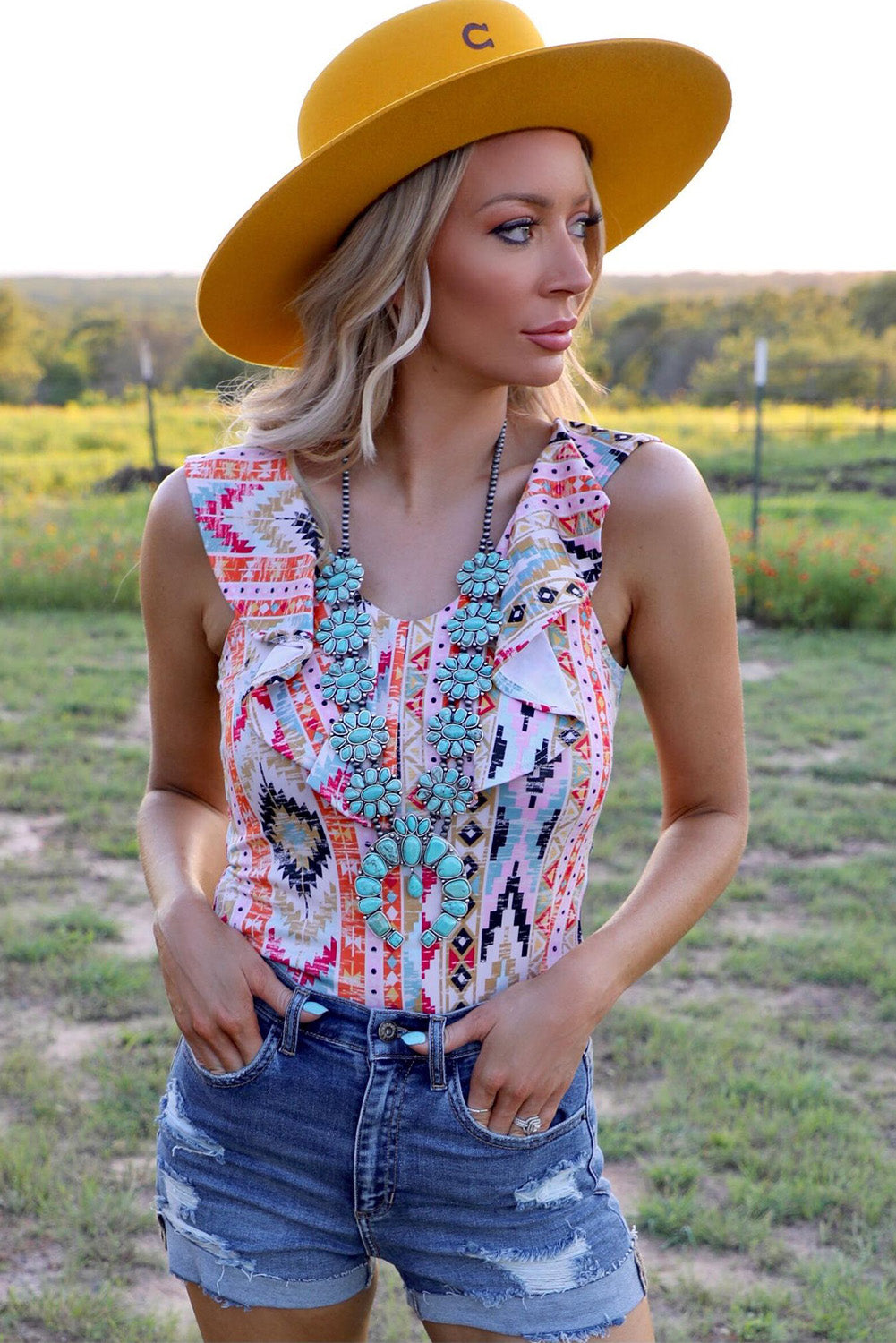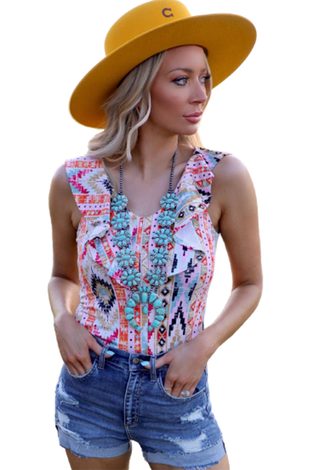 Western Aztec Print Ruffled Sleeveless Bodysuit