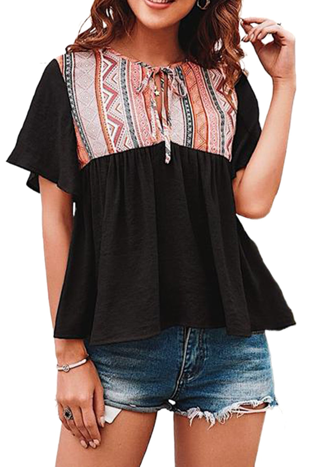 Western Serape Patchwork Flounce Short Sleeve Top